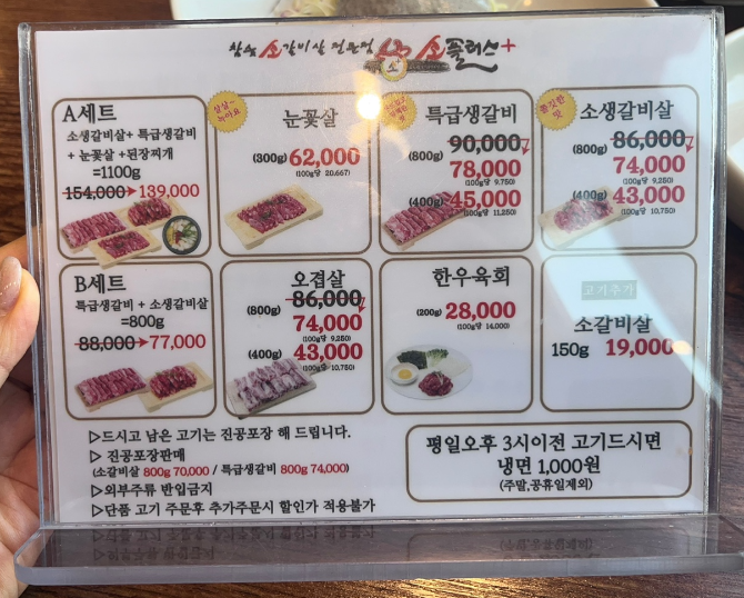 1100g A셋트메뉴가 139000원이다. 생갈비살, 특급생갈비, 눈꽃살 구성이고, 된장찌게하나 나온다.