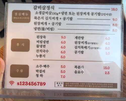뒷면의 점심 갈비살 정식은 18000원이다. 잘못본거 아닌가 싶어 다시 보니 18000원 맞다.
