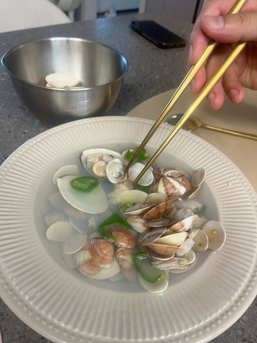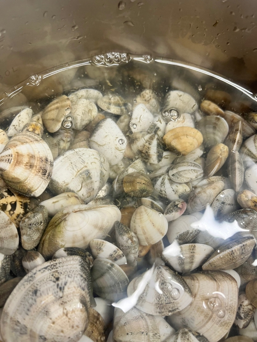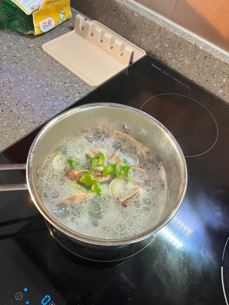 물이 끓기전에 조개가 입을 벌리고