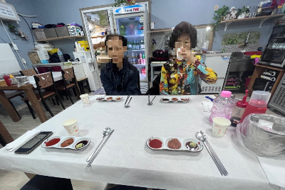 바닥까지 먹는 짝궁을 보고 지나가던 사장님이 칭찬한다.