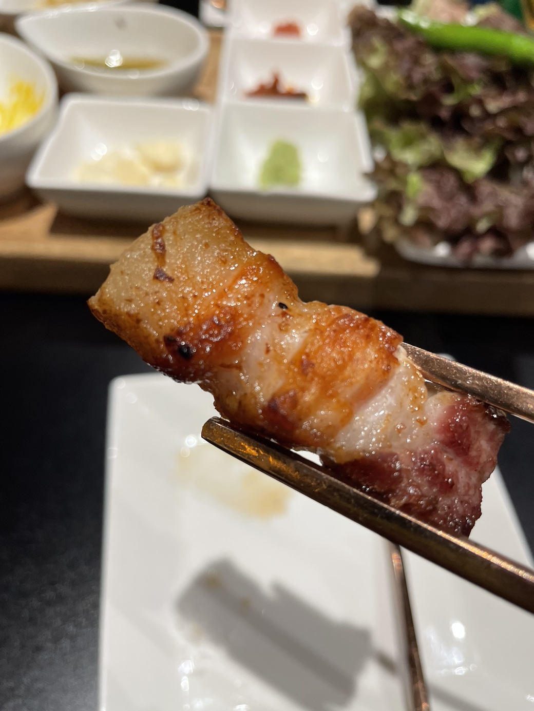굽는사람의 문제는 아닌것 같은데 뒤에주문한 삼겹살은 고기와 기름사이에 질긴부분도 조금 있었다.