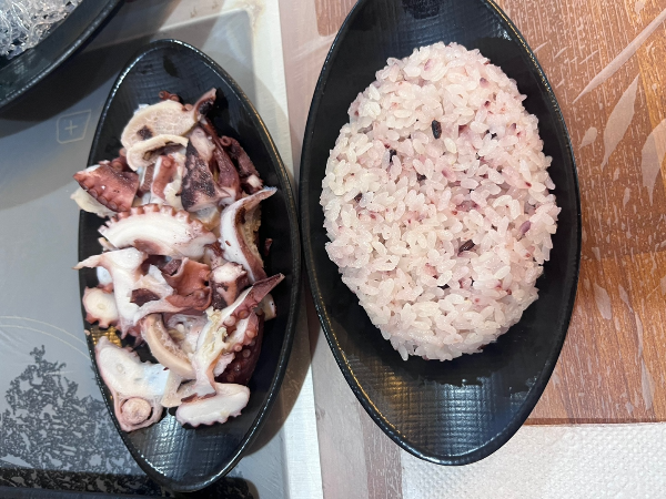 초밥용 밥에 와사비 한점 얹고 문어 숙회.