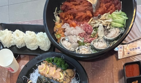물회가 새콤매콤하고 전복이 네마리나 들어있다. 중간중간 회도 씹히고, 개불과 야채가 조합이 좋다.