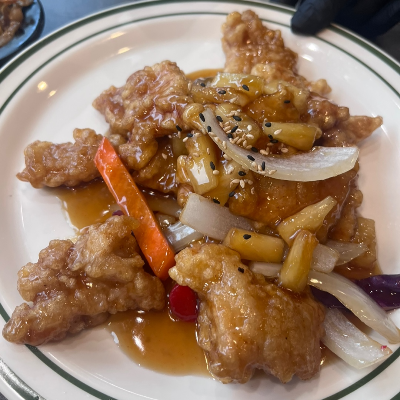 소스가 부어져 나오는데 바삭한 느낌보다는 부드러운 식감이다.