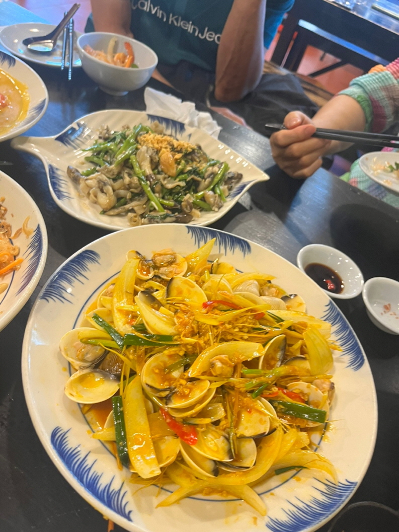 해산물 자몽 샐러드와 새우, 조개 공심채 볶음. 조개 볶음 이렇게 시켜봄.