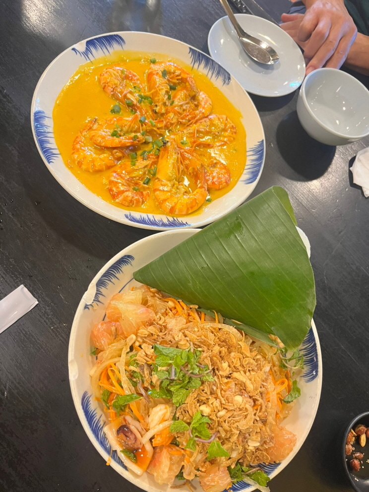 위의것 새우 커리. 아래것 자몽 해산물 샐러드