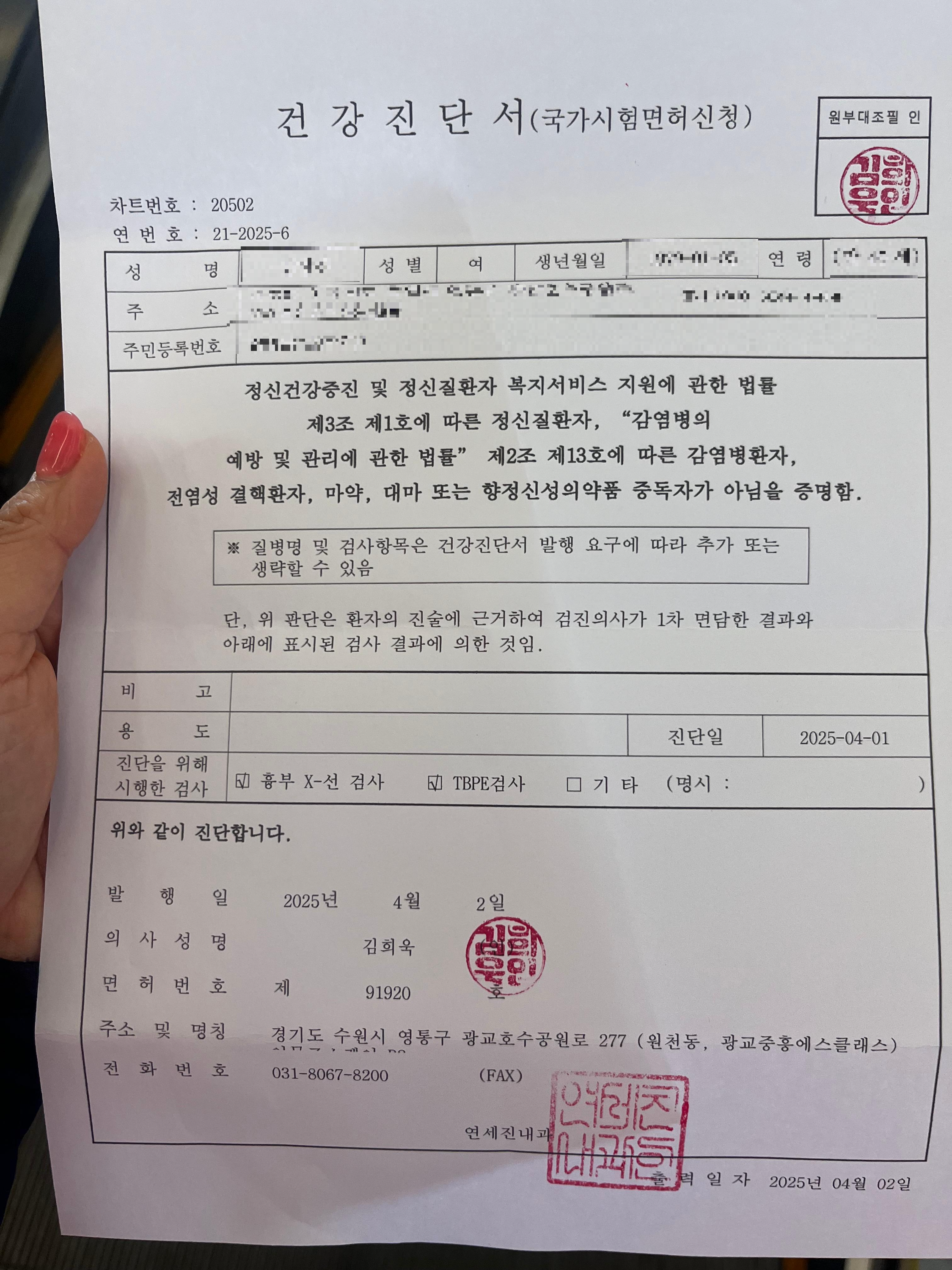 가까운 곳에 있는 내과에 가서 면허용 건강검진 받으러 왔다고 하자 문구 보여달라고 함.