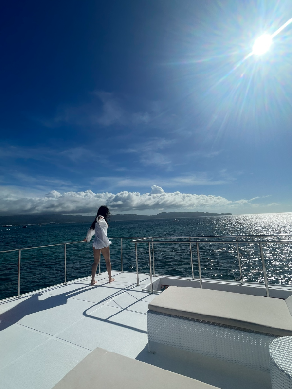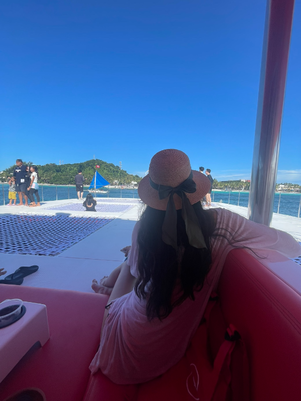 배 뒤에 다리를 걸치고 앉아 보라카이 풍경을 느낀다.