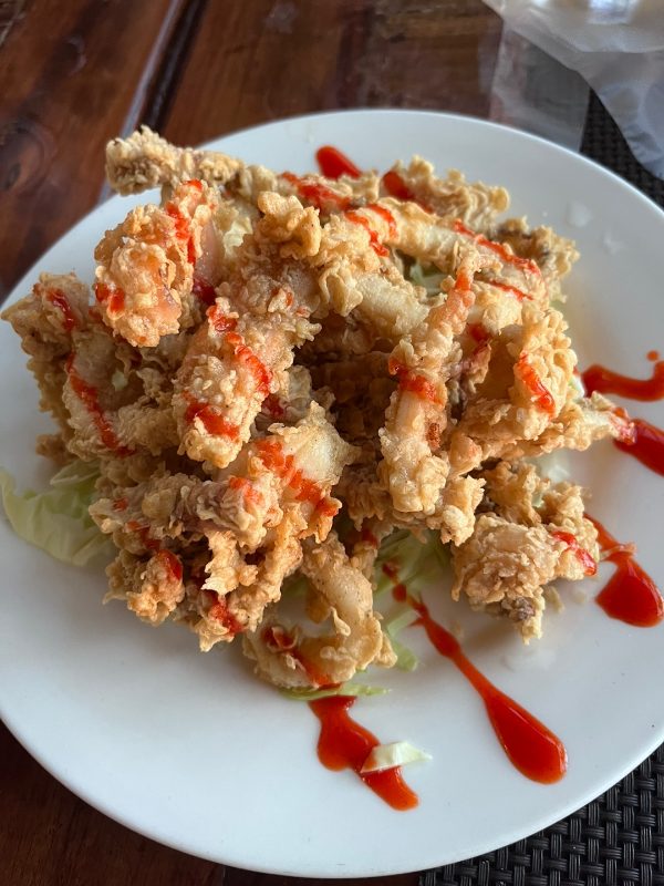 첫번째 메뉴 갑오징어 튀김이 나왔다. 갈릭 라이스도.