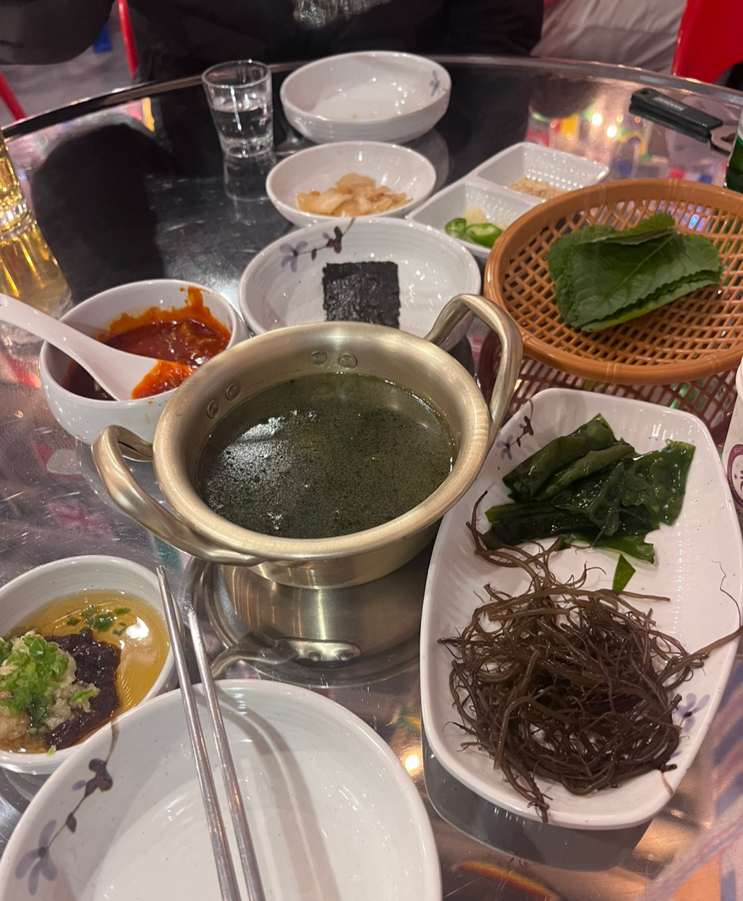 미역국 간단하니 나오고, 해초와 초장, 깻잎 몇장, 백김치, 고추마늘과 콩가루, 김 몇장, 쌈장 셋팅된다.