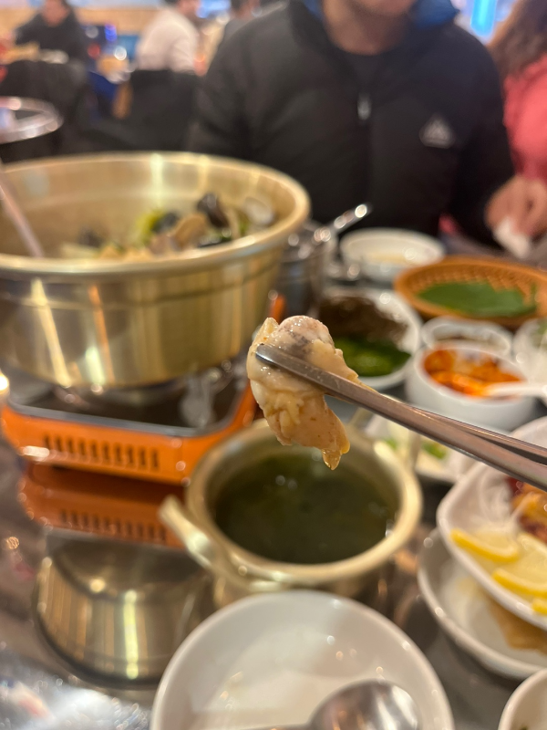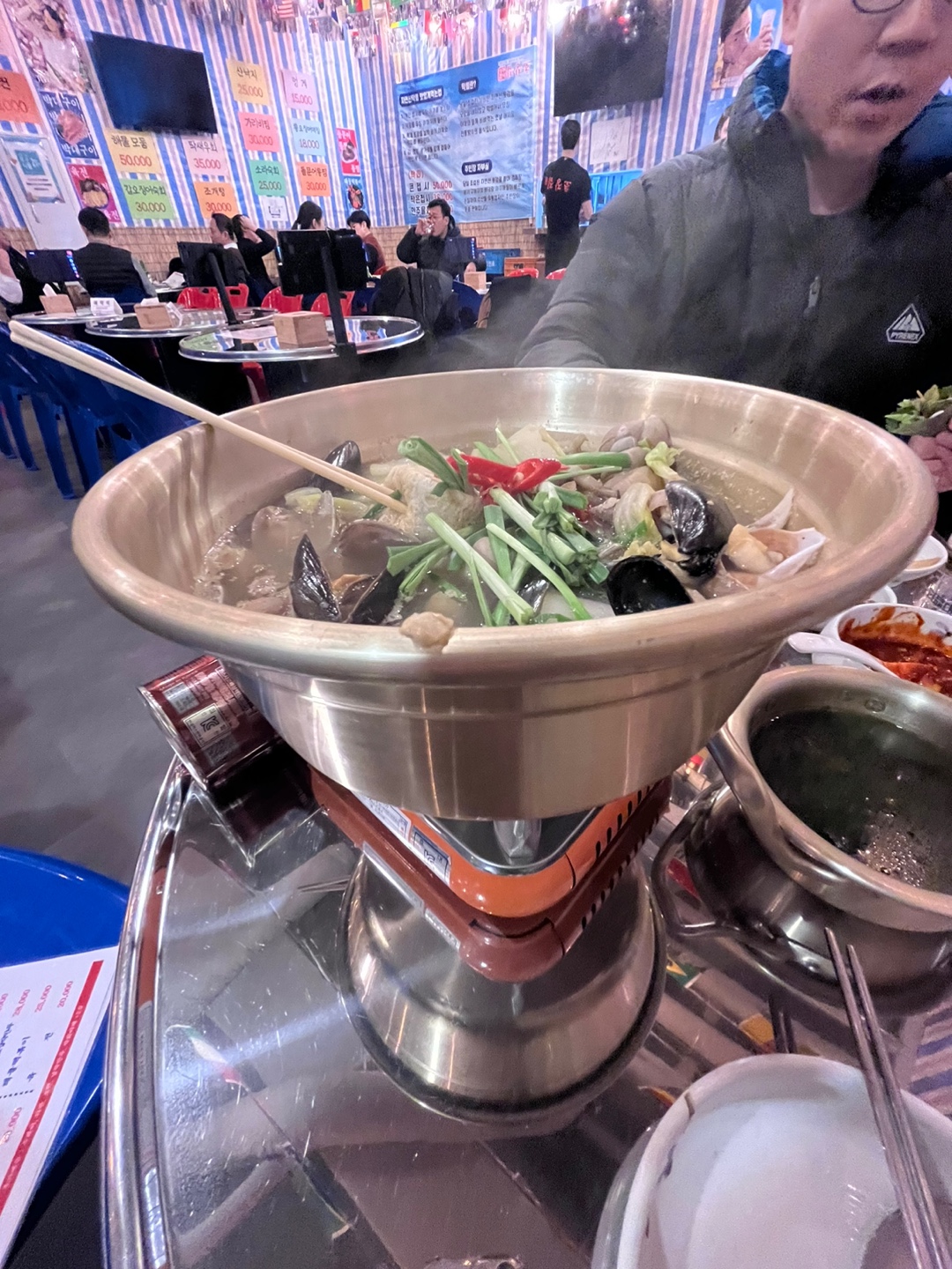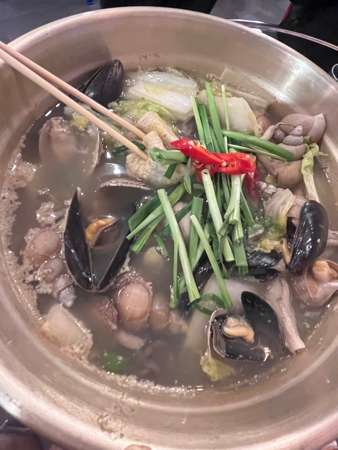 골뱅이와 조개, 홍합, 버섯과 야채를 넣고 끓인탕에 오뎅 두개 얹어져 있다. (35000원)