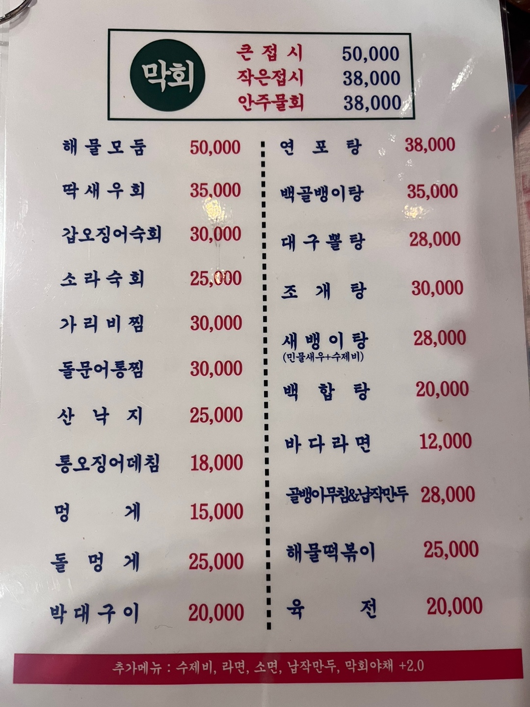 주메뉴 막회 큰접시 50000원, 작은접시 38000원이다.