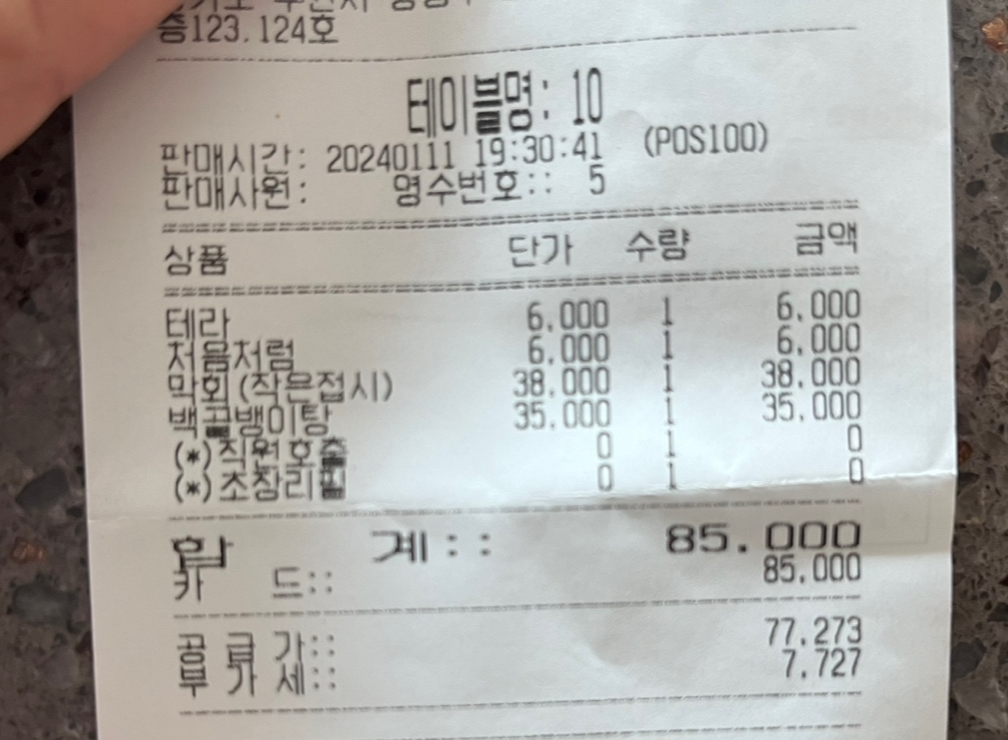 막회 작은접시 38000원 백골뱅이탕 35000원, 노란탄산, 하얀음료 각 1씩 총 85000원.