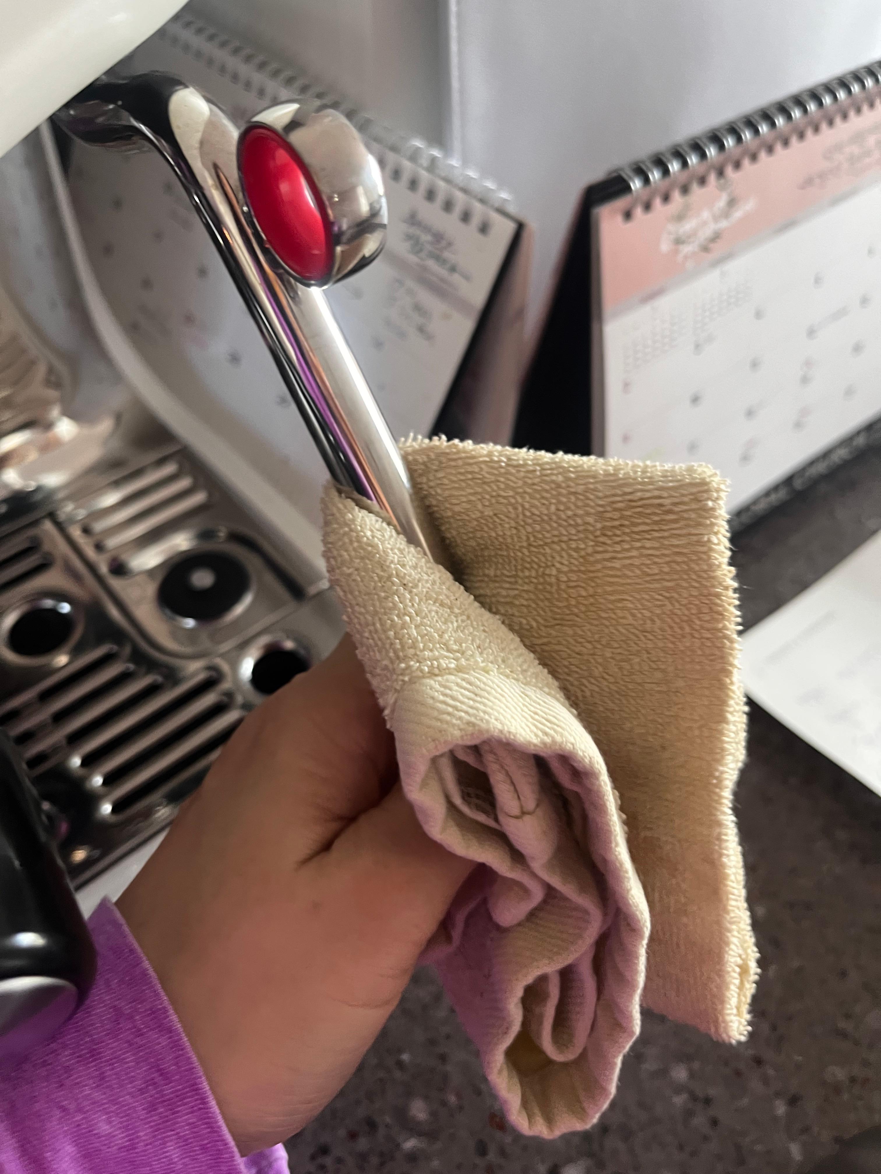 우유저그를 빼고 스팀봉이 올라간 상태에서 수건으로 봉 아래를 닦아주고 스팀봉을 제자리로 내리면