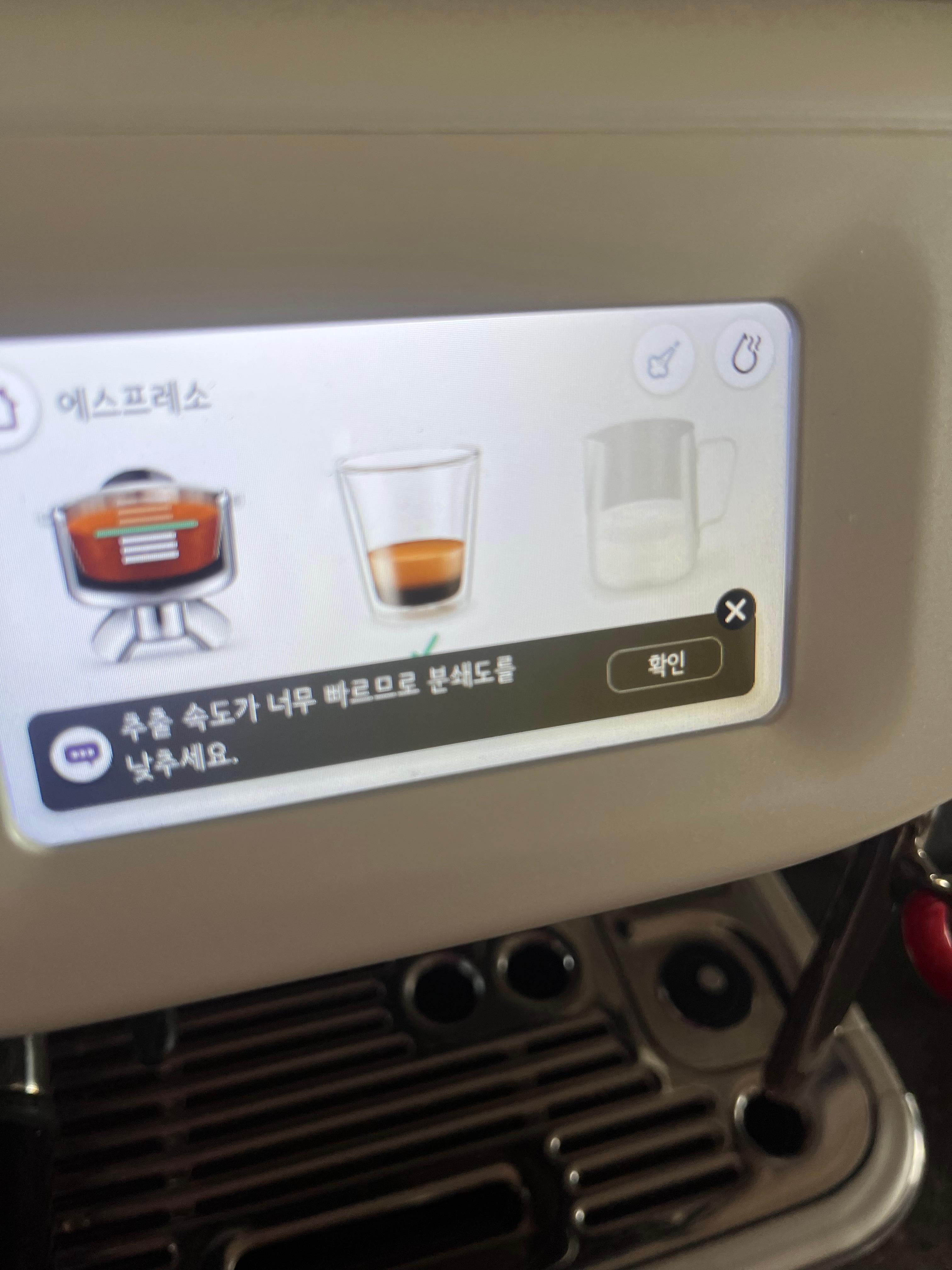 분쇄되는 양이 적거나 하면 템핑후에 더 분쇄하라는 'a bit more'라는 알람이 뜨죠.