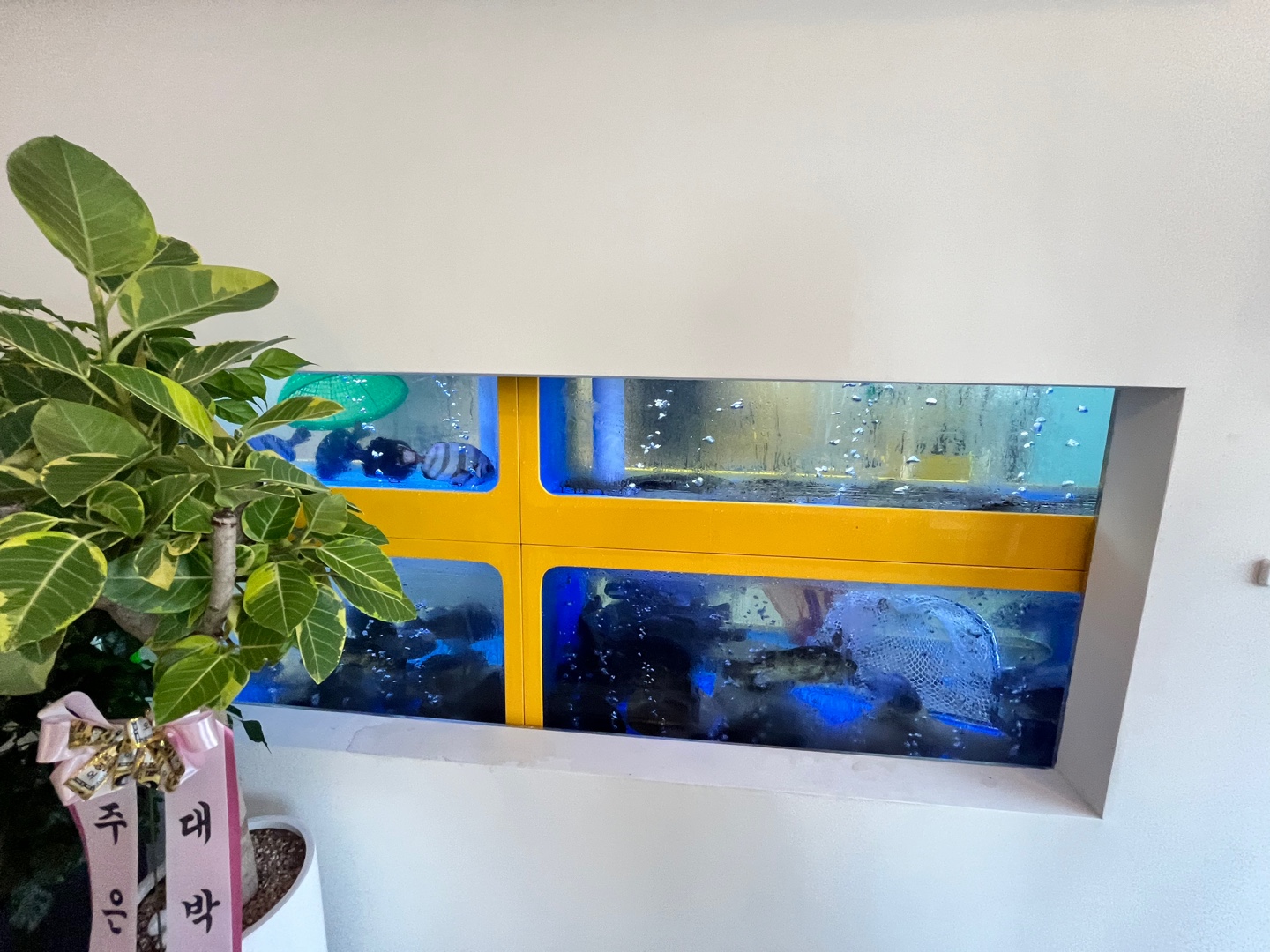 들어가는 입구에 수족관과 초밥 모형이 있다.