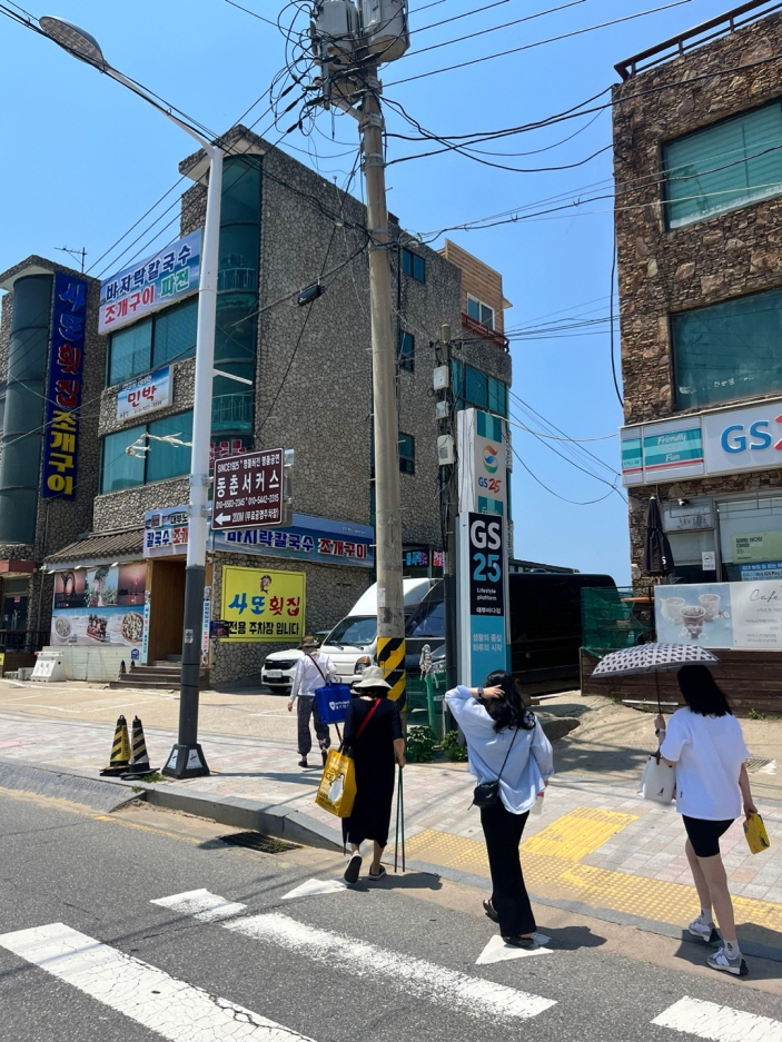 주차장 입구에서 길을 건너가요!