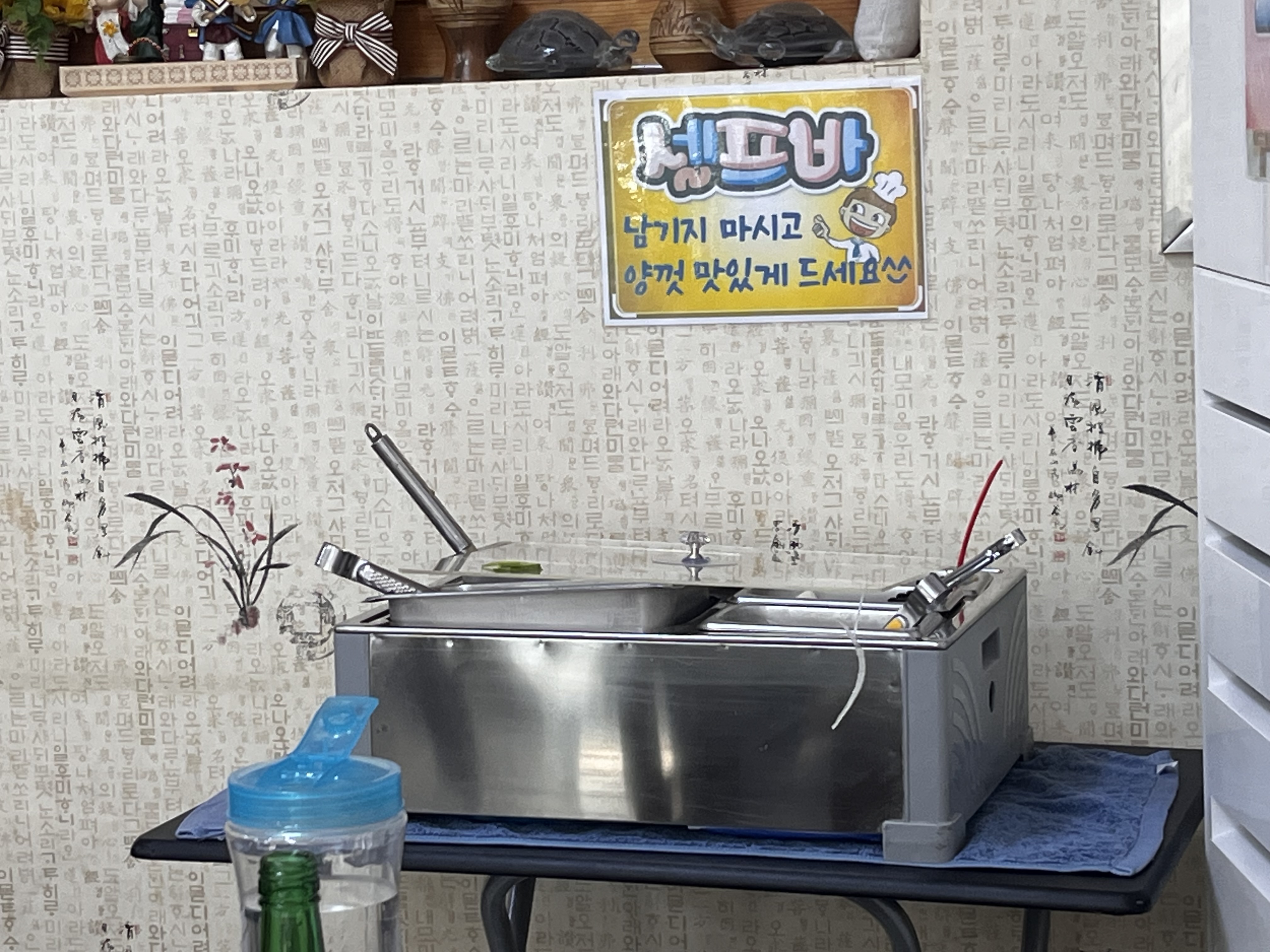 한쪽에는 셀프바가 있고 그안에 부추, 양파, 깍두기 등등을 가져다 먹을수 있도록 셋팅되어 있음