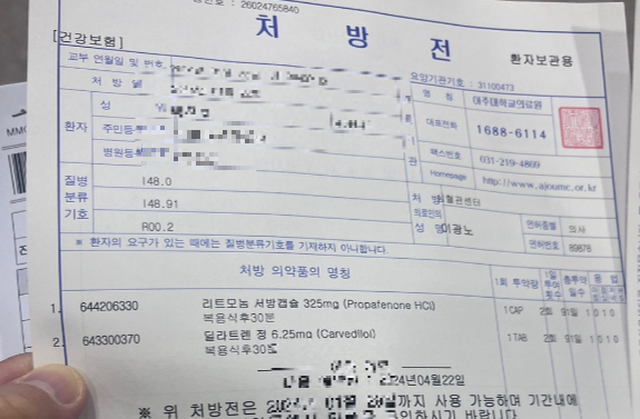 처방전에는 여전히 리트모놈 325와 딜라트렌 6.25 가 적혀있다.