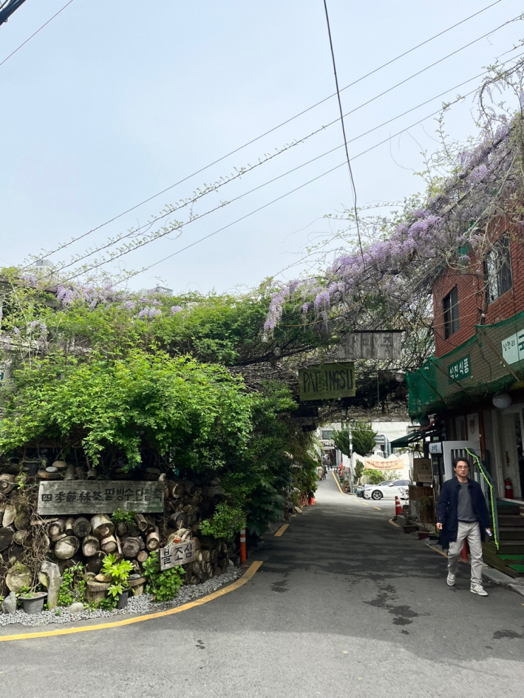 기다리며 근처 돌아보니 팥빙수 맛집에 등나무가 근사하게 펴있다.