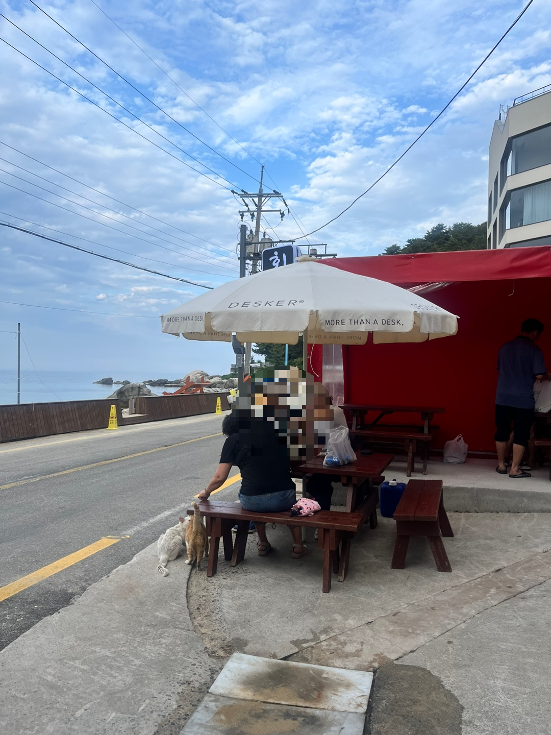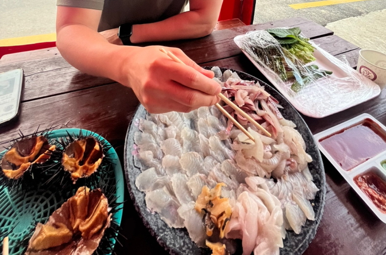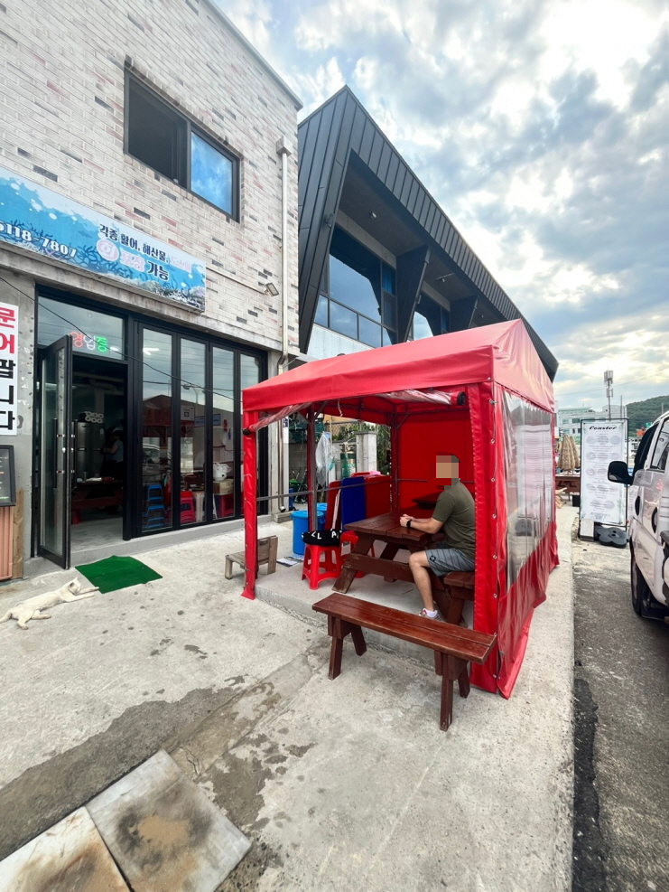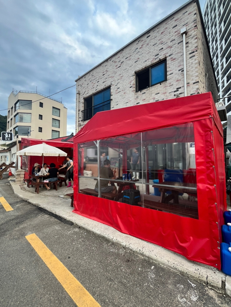 해변에서 야외테이블에 앉아 먹는 횟집