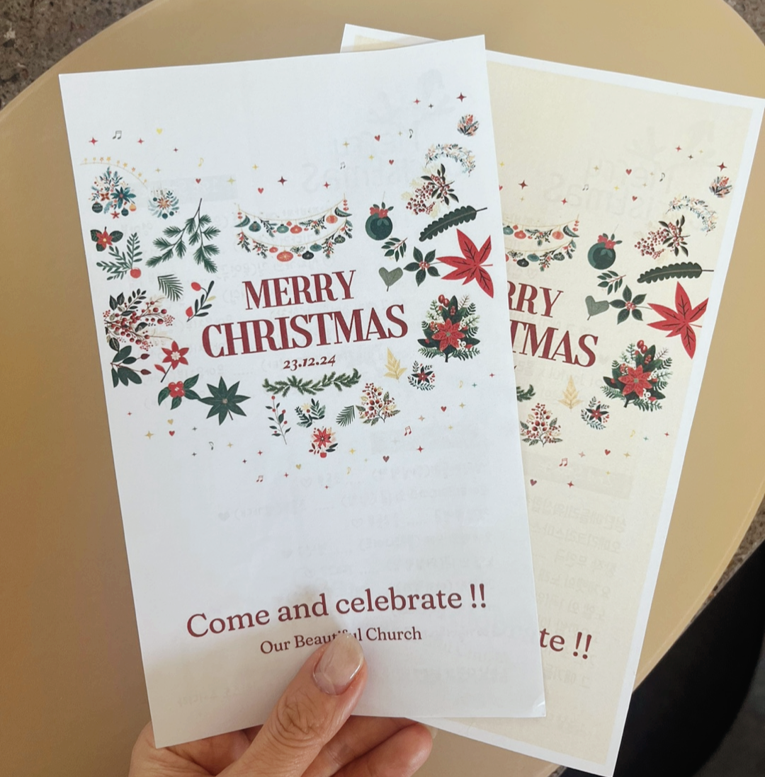 크리스마스 이브 순서지와 함께 25일에 있을 성탄감사예배 순서지도 만들어 본다. 크리스마스 행사는 파티같은 느낌이라면 성탄예배는 예배같은 조금더 차분한 느낌으로. 샘플 여러가지 만들어