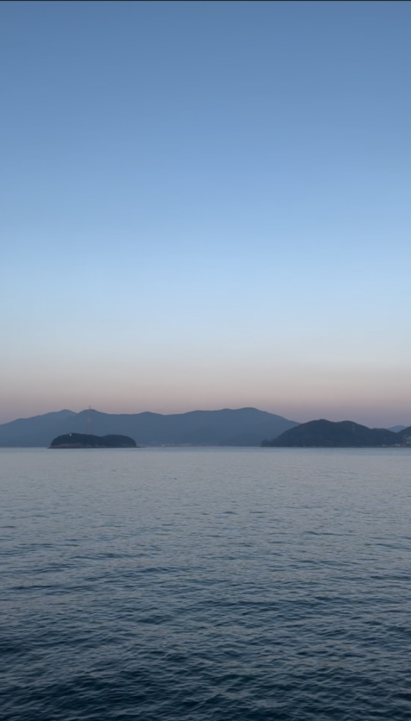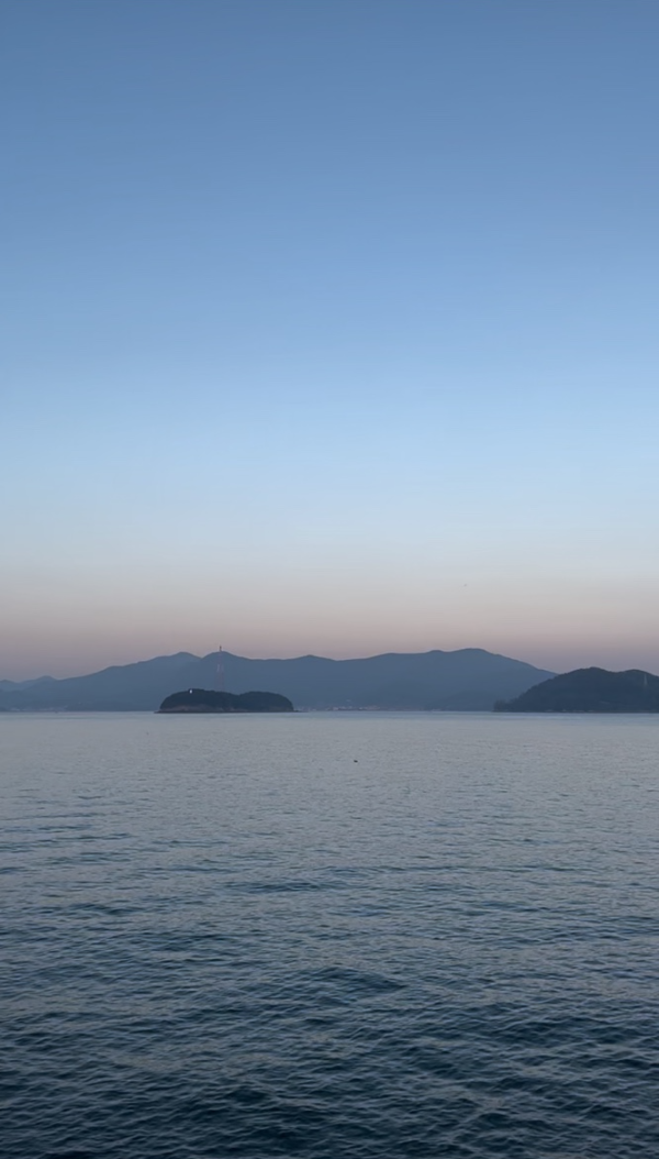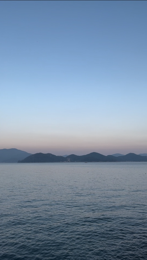 해지는 저녁 보라빛 노을과 아름다운 바다와 떠있는듯한 섬들이