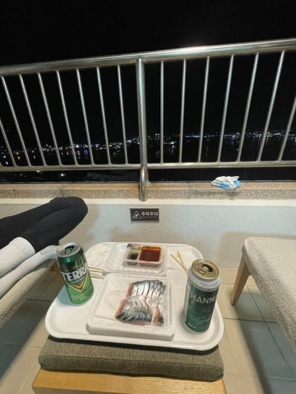 저녁 바다 바람을 맞으며 호기롭게 회를 즐긴다.