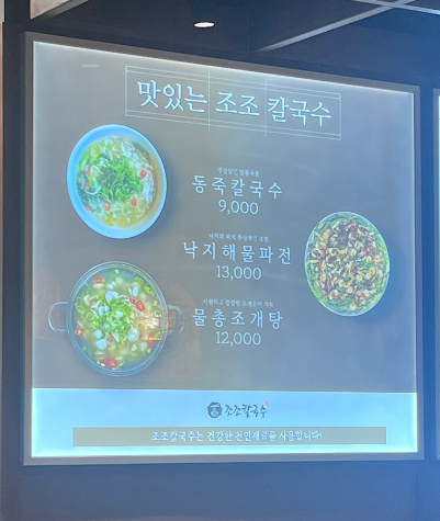 동죽칼국수 9000원, 낙지해물파전 13000원, 물총 조개탕 12000원