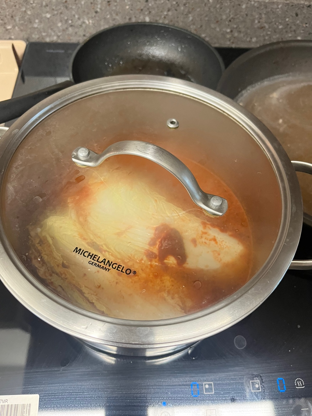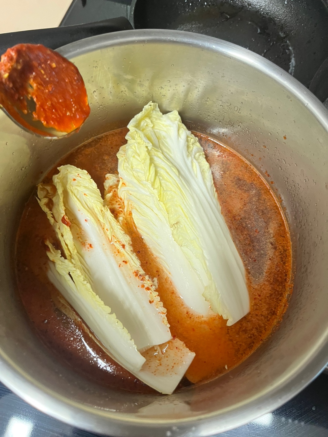 코인육수 1개 풀고, 고추장, 마늘, 고추가루, 후추가루, 올리고당, 간장을 넣고 알배추를 먼저 넣고 끓임