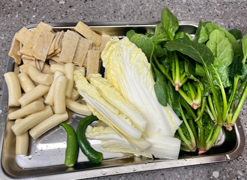 알배추(노란것) 10장정도. 시금치 5뿌리. 떡, 오뎅3장, 파조금, 청량고추 두개, 삶은계란 2개