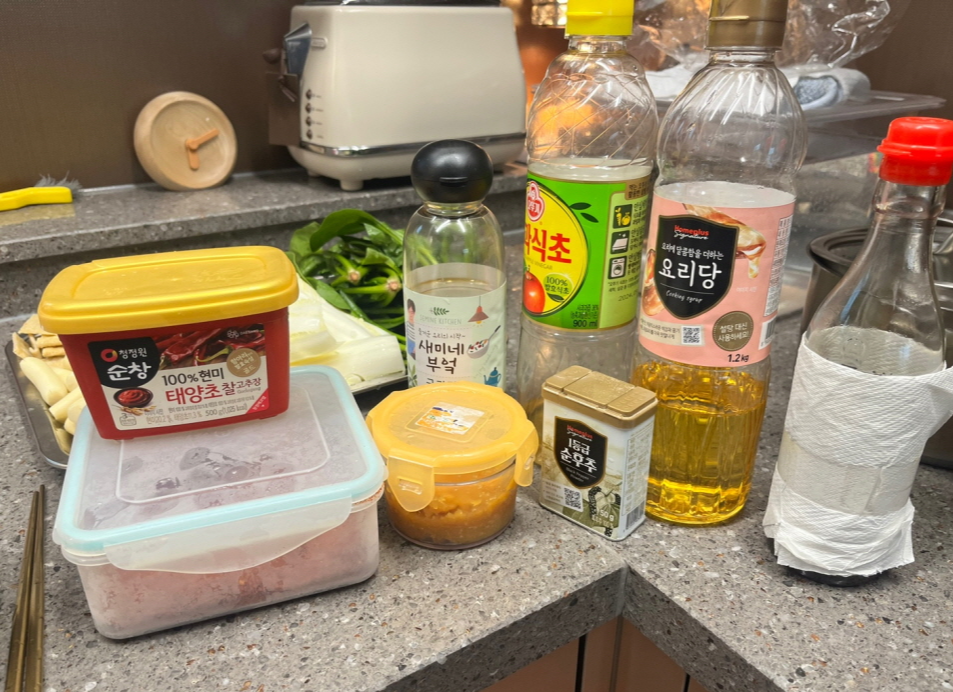 마늘 반스푼, 고추장 2 큰스푼, 고춧가루 2스푼, 후추가루 적당히, 올리고당 1스푼, 간장 1스푼,