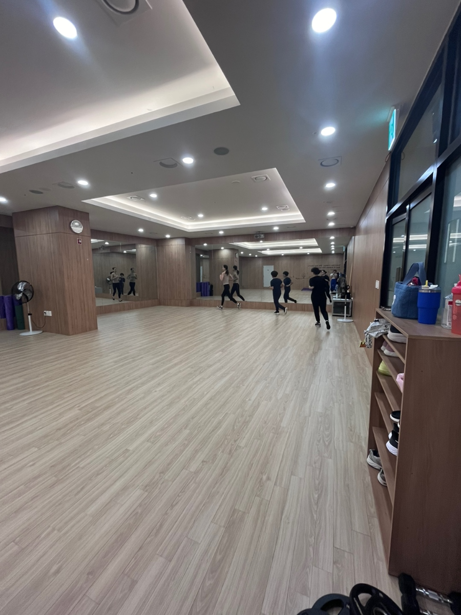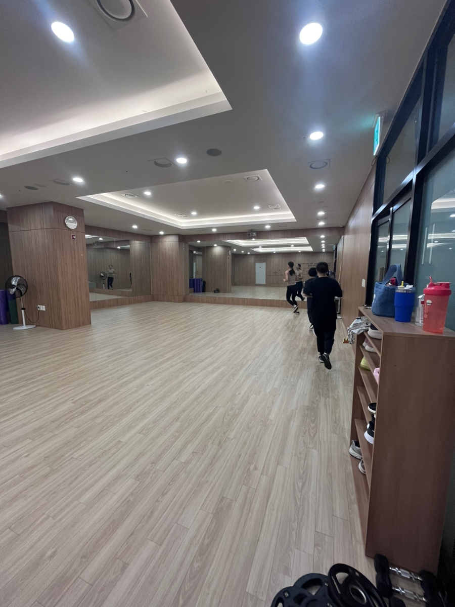 20m x 10m 정도 되는 넓은방에 거울이 2면 둘러져 있고 매트와 간단한 맨몸운동용 도구들이 있다.
