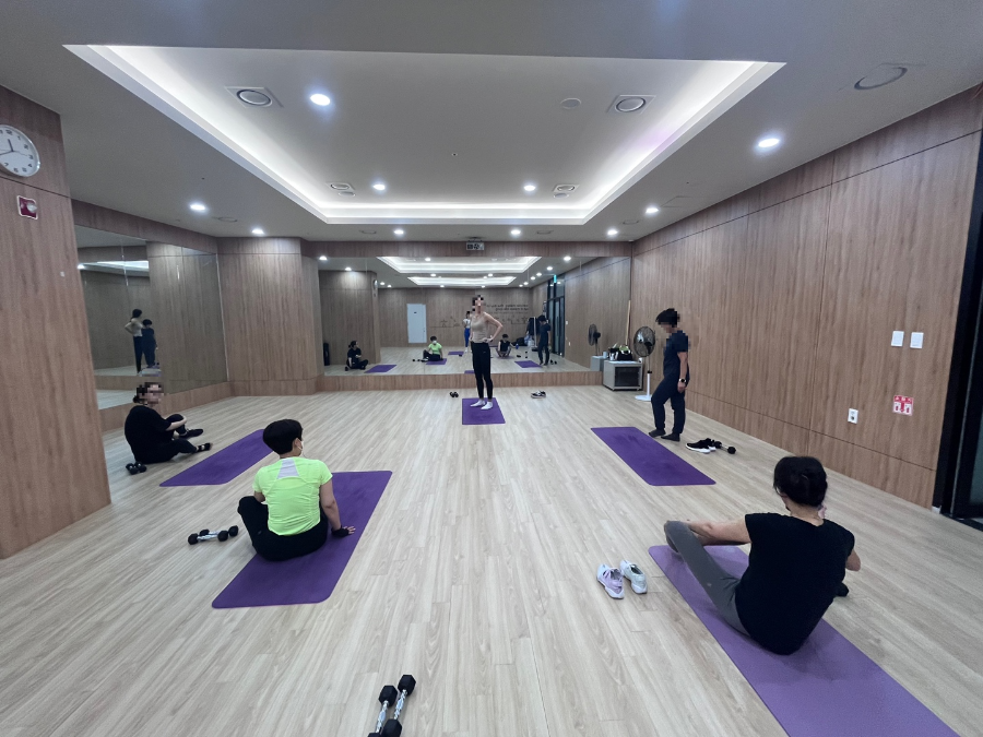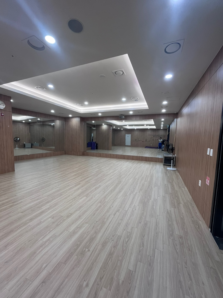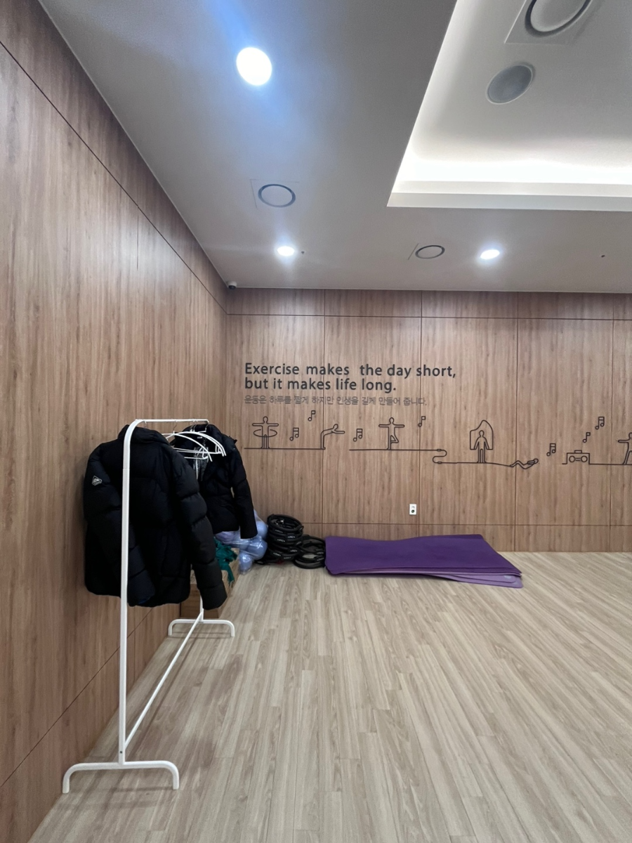 20m x 10m 정도 되는 넓은방에 거울이 2면 둘러져 있고 매트와 간단한 맨몸운동용 도구들이 있다.